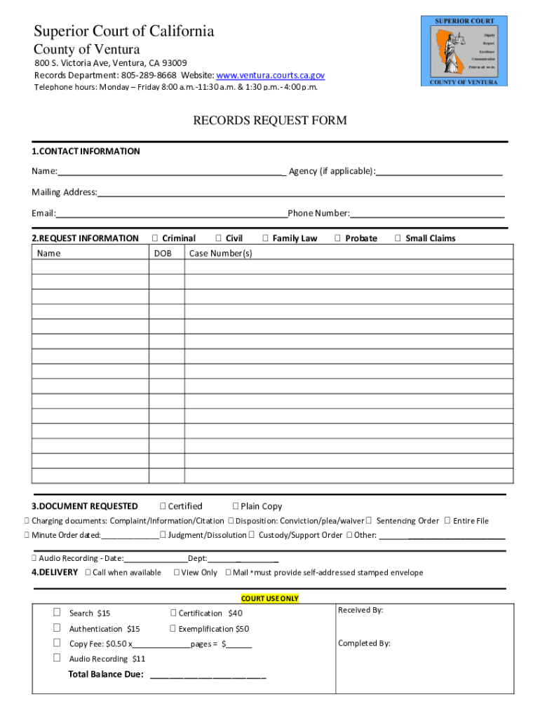 Superior Court of California County of Ventura 800 S. Victoria Ave, Ventura, CA 93009 Records Department: 8052898668 Website: www.ventura.courts.ca.gov Telephone hours: Monday Friday 8:00 a.m.11:30