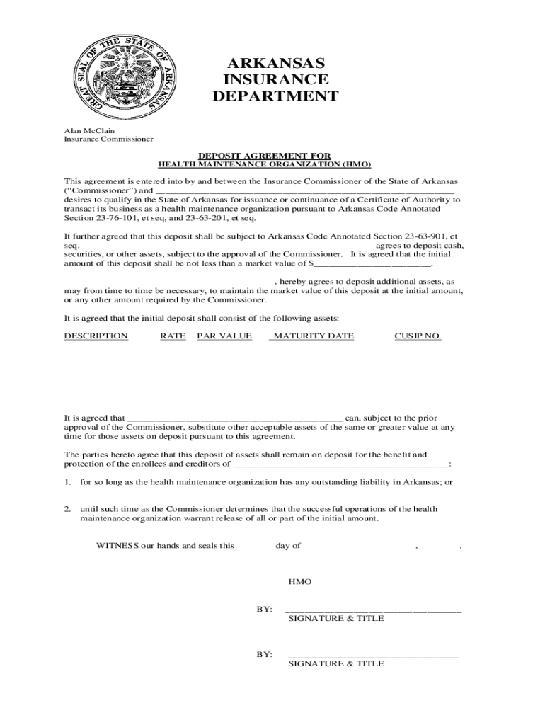 ARKANSAS INSURANCE DEPARTMENT Alan McClain Insurance CommissionerDEPOSIT AGREEMENT FOR HEALTH MAINTENANCE ORGANIZATION (HMO)This agreement is entered into by and between the Insurance Commissioner