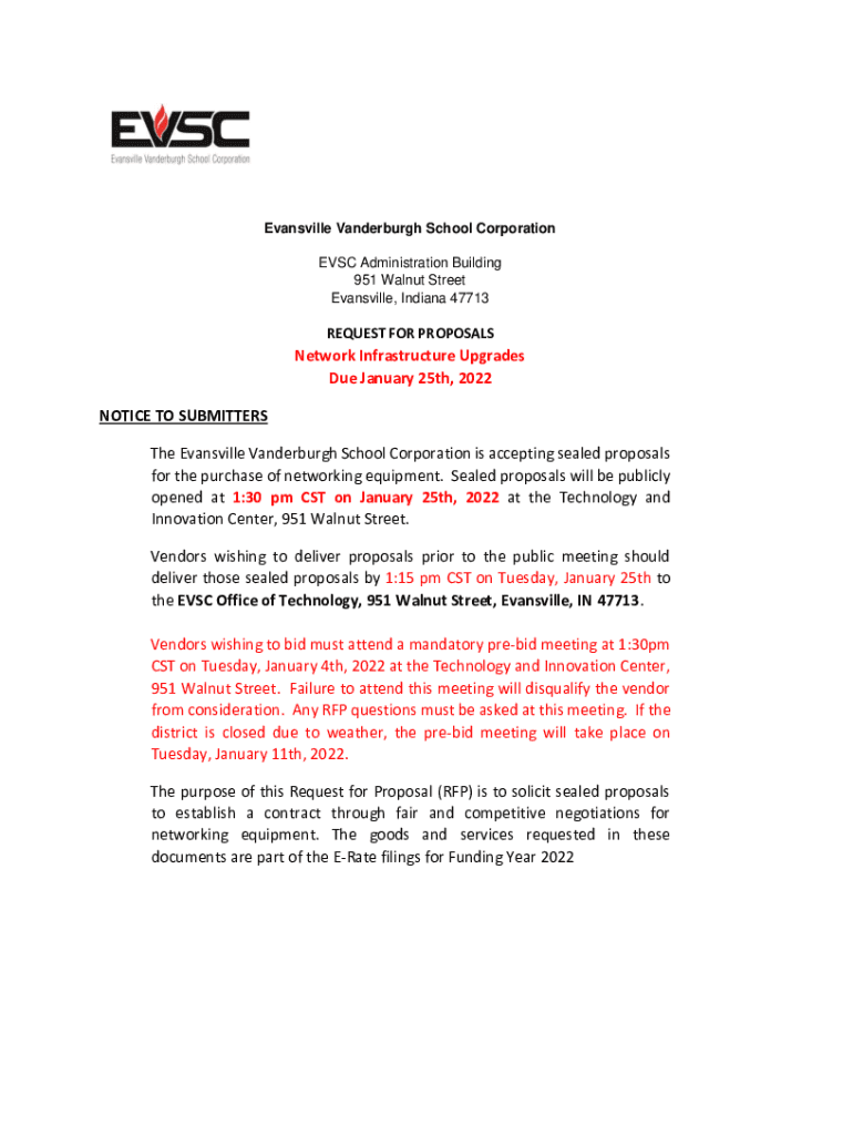 Evansville Vandenberg School Corporation ESC Administration Building 951 Walnut Street Evansville, Indiana 47713REQUEST FOR PROPOSALSNetwork Infrastructure Upgrades Due January 25th, 2022 NOTICE TO
