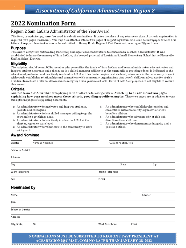 Association of California Administrator Region 22022 Nomination Form Region 2 Sam La Cara Administrator of the Year Award This form, or a photocopy, must be used to submit nominations. It takes the