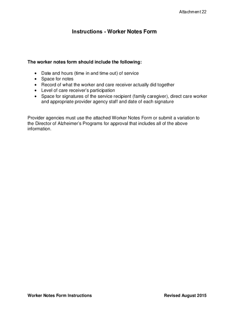 Attachment 22Instructions Worker Notes Forth worker notes form should include the following: Date and hours (time in and time out) of service Space for notes Record of what the worker and care receiver