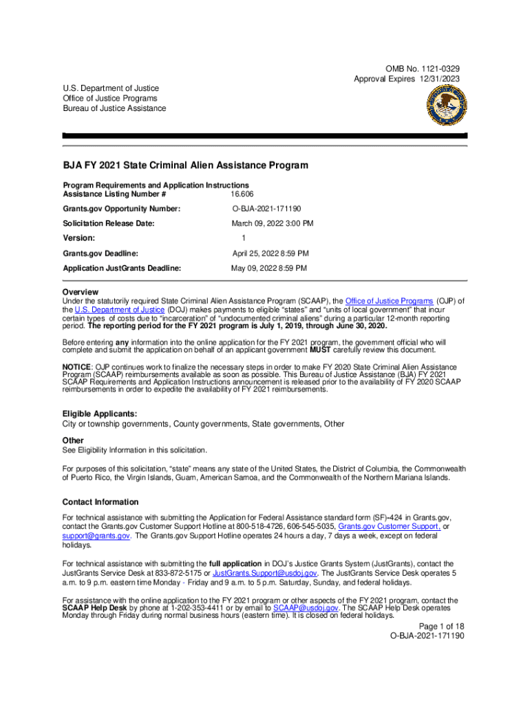 OMB No.11210329 Approval Expires 12/31/2023 U.S. Department of Justice Office of Justice Programs Bureau of Justice Assistance FY 2021 State Criminal Alien Assistance Program Requirements and Application