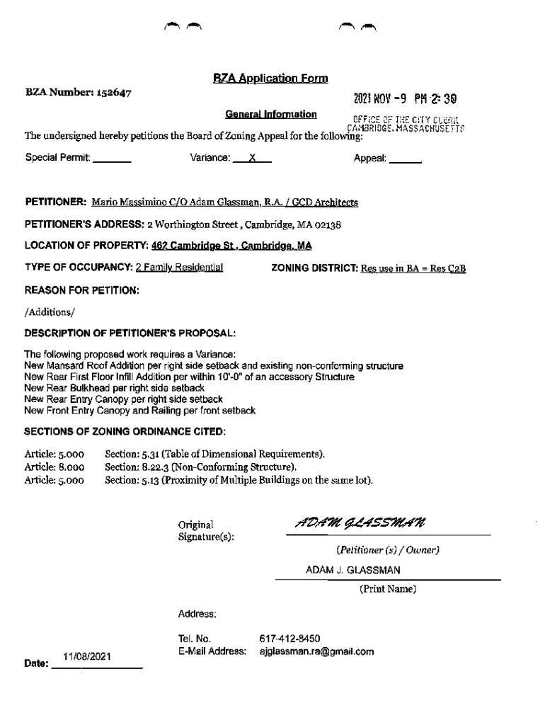 BZA Application Form Number: 1526472021 NOV 9 PM 2: 39 OFFICE OF THE CITY CLC:i(general InformationCAi1BRIOGE. HASSACHUSETTThe undersigned hereby petitions the Board of Zoning Appeal for the following:
