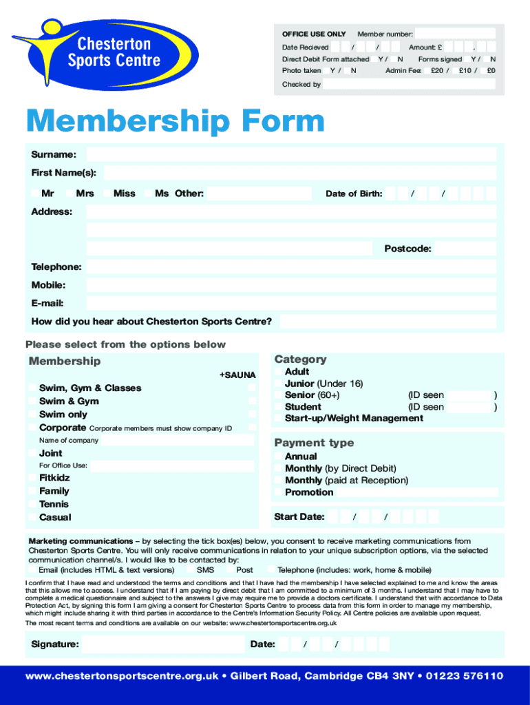 OFFICE USE ONLY Date RecievedMember number: /Direct Debit Form attached Photo taken //Amount: Y/IN. Forms signedAdmin Fee:20 /Y/10 /N 0Checked membership Form Surname: First Name(s): MrMrsMissMs Other:Date