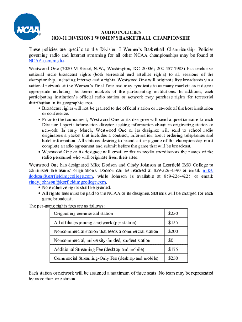 AUDIO POLICIES 202021 DIVISION I WOMEN BASKETBALL CHAMPIONSHIP These policies are specific to the Division I Women's Basketball Championship. Policies governing radio and Internet streaming for all