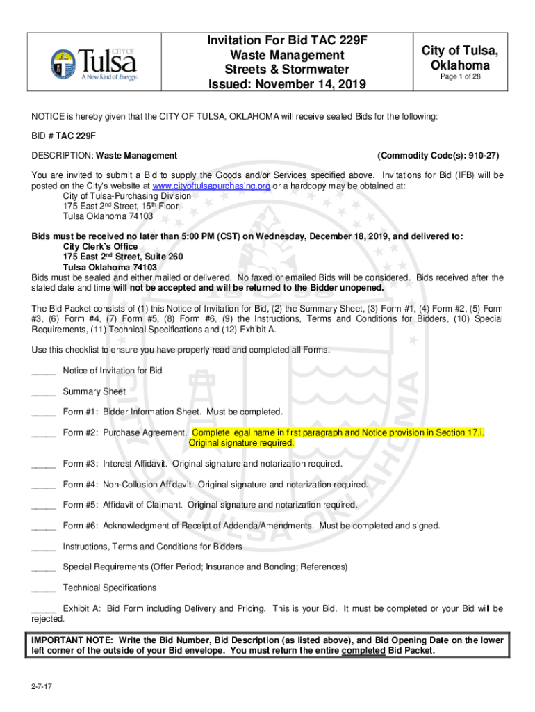Invitation For Bid TAC 229F Waste Management Streets & Stormwater Issued: November 14, 2019City of Tulsa, Oklahoma Page 1 of 28NOTICE is hereby given that the CITY OF TULSA, OKLAHOMA will receive