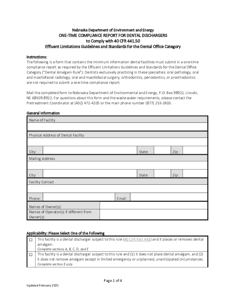 Nebraska Department of Environment and EnergyONETIME COMPLIANCE REPORT FOR DENTAL DISCHARGERS to Comply with 40 CFR 441.50 Effluent Limitations Guidelines and Standards for the Dental Office Category