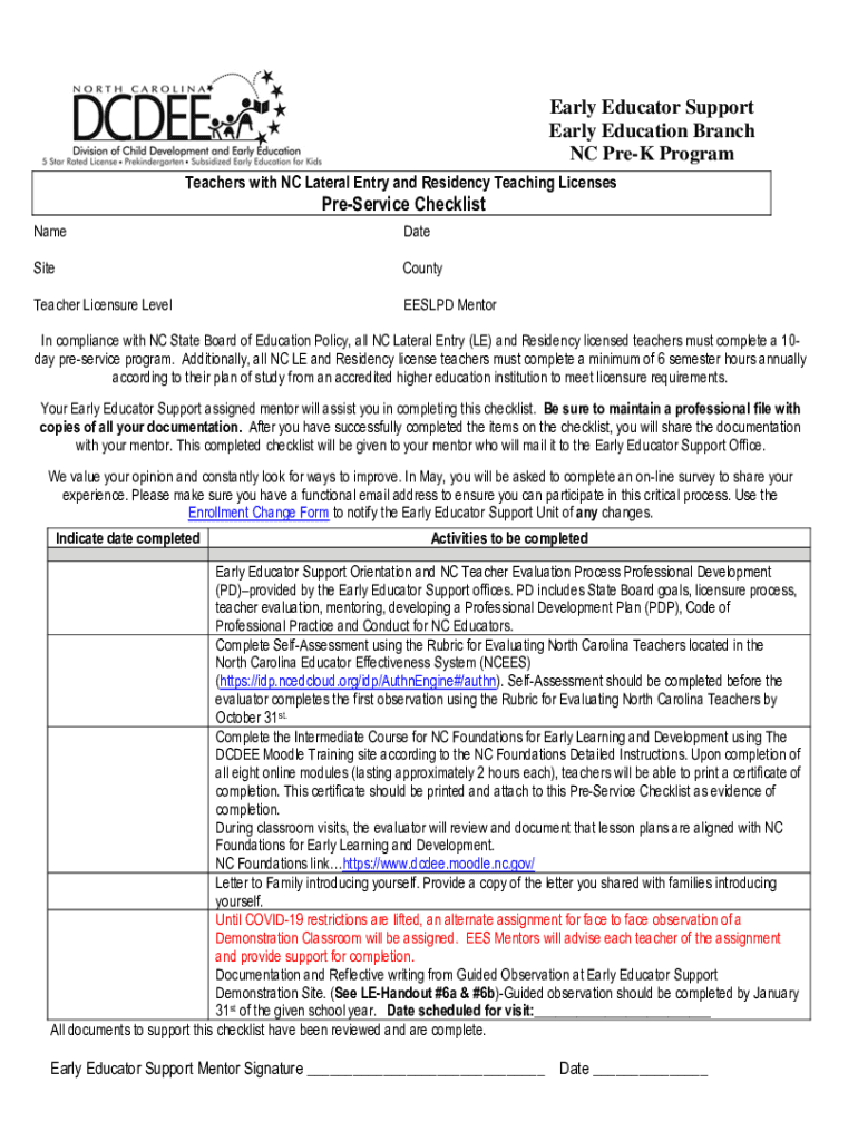Early Educator Support Early Education Branch NC Prey Program Teachers with NC Lateral Entry and Residency Teaching LicensesPreService ChecklistNameDateSiteCountyTeacher Licensure LevelEESLPD Mentoring