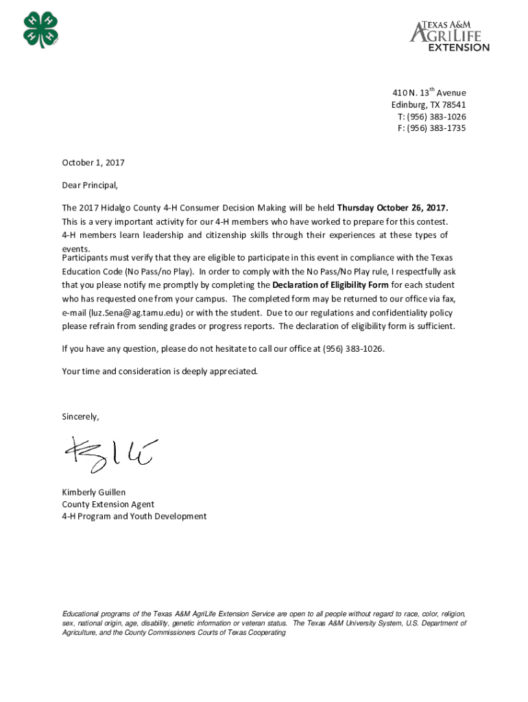 410 N. 13th Avenue Edinburg, TX 78541 T: (956) 3831026 F: (956) 3831735 October 1, 2017, Dear Principal, The 2017 Hidalgo County 4H Consumer Decision Making will be held Thursday, October 26, 2017.