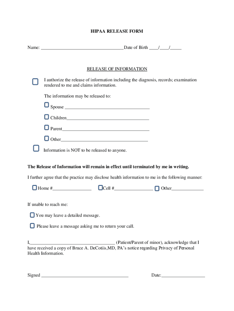 HIPAA RELEASE Forename: ___ Date of Birth ___/___/___RELEASE OF INFORMATION I authorize the release of information including the diagnosis, records; examination rendered to me and claims information.