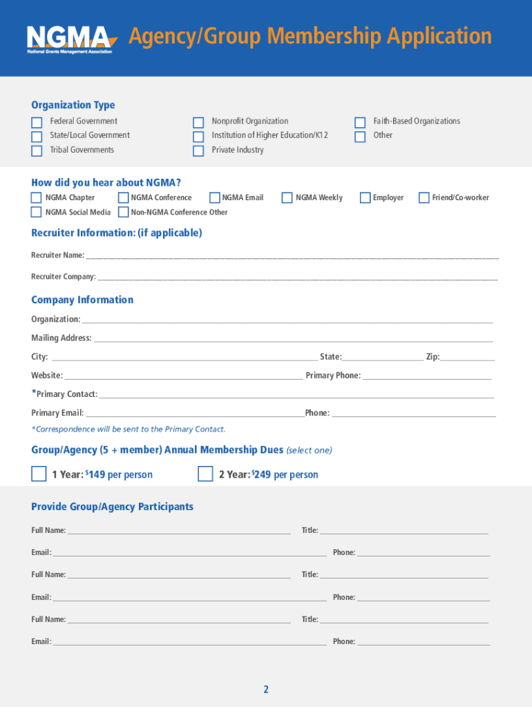 The wwwngmaorgassetsdocsagencygroup membership application is required for individuals or organizations interested in joining the Agency Group of the National Grants Management Association (NGMA).