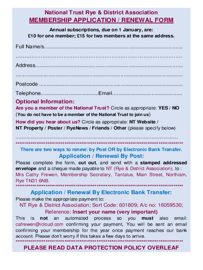 National Trust Rye & District AssociationMEMBERSHIP APPLICATION / RENEWAL FORM Annual subscriptions, due on 1 January, are: 10 for one member; 15 for two members at the same address. Full Name/s...............................................................................................