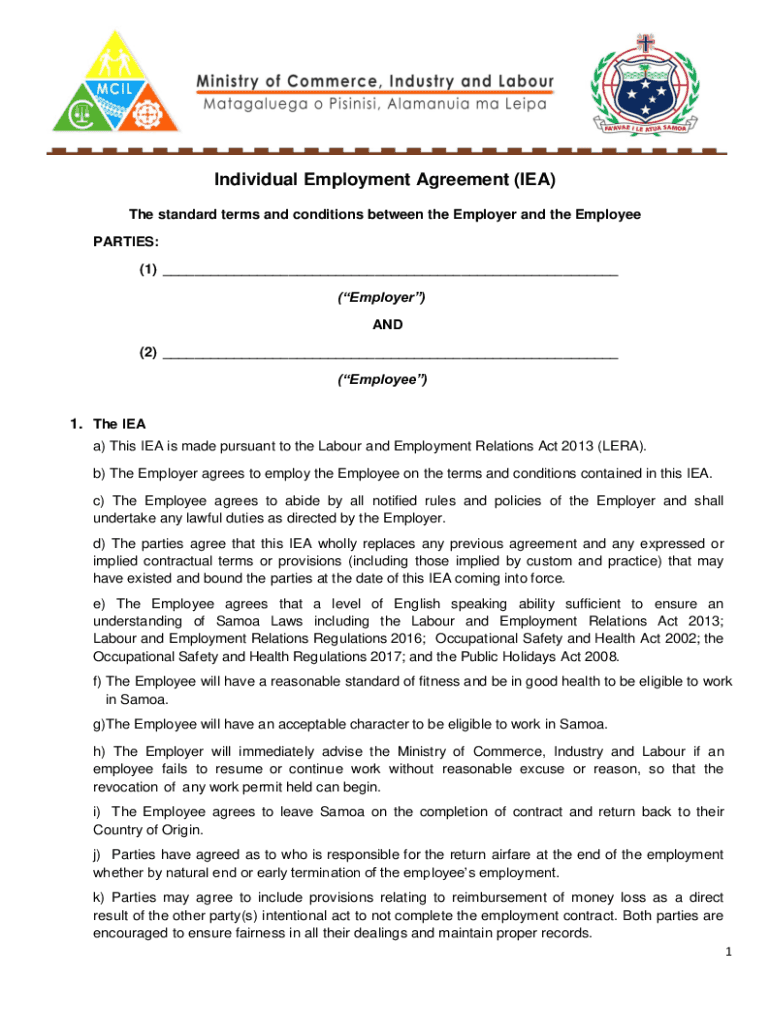Individual Employment Agreement (IEA) The standard terms and conditions between the Employer and the Employee PARTIES: (1) ___ (Employer) AND (2) ___ (Employee)1. The IEA a) This IEA is made pursuant