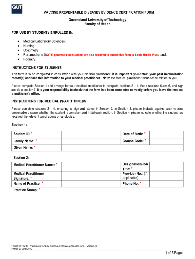 VACCINE PREVENTABLE DISEASES EVIDENCE CERTIFICATION FORM Queensland University of Technology Faculty of Health FOR USE BY STUDENTS ENROLLED IN: Medical Laboratory Sciences; Nursing; Optometry; Para