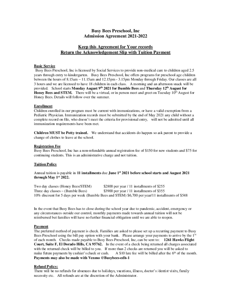 Busy Bees Preschool, Inc Admission Agreement 20212022 Keep this Agreement for Your records Return the Acknowledgement Slip with Tuition Payment Basic Service Busy Bees Preschool, Inc is licensed by