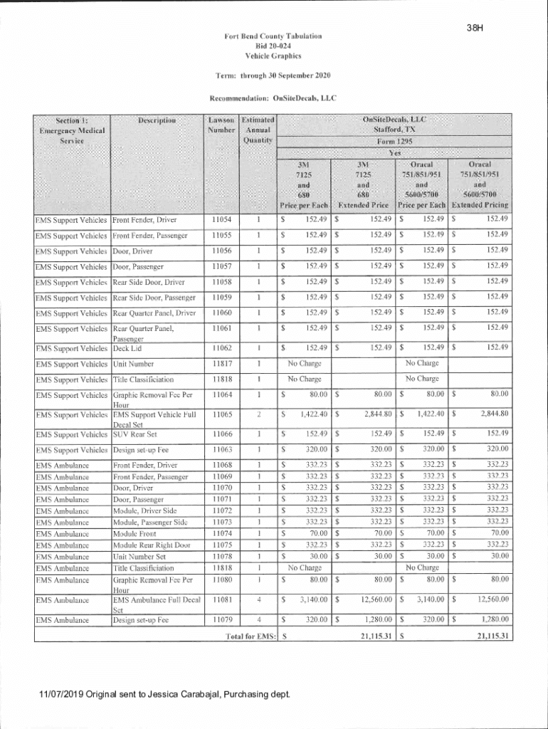 38H Fort Bend County Tabulation Bid 20024Vehicle GraphicsTerm: through 30 September 2020 Recommendation: OnSiteDecals, LLCDescriptionSection 1:Emergency MedicalOnSiteDecals, LLC Stafford, TX Lawson