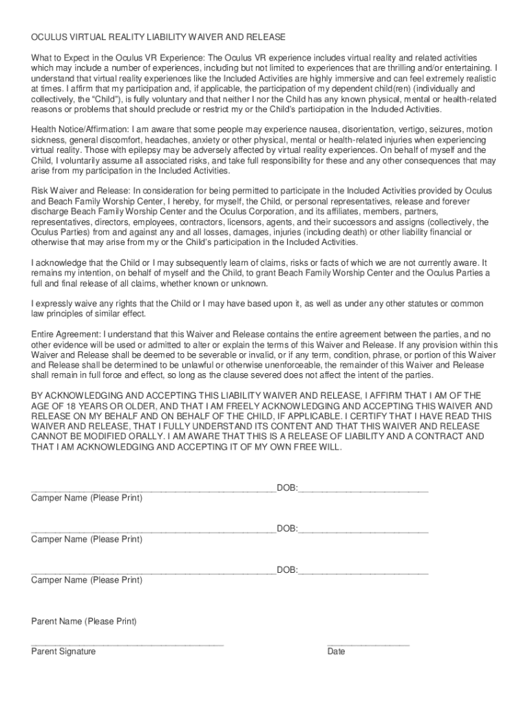 The beachfamilyinfo07virtual-reality-waiveroculus virtual reality liability form may require information such as name, contact details, acknowledgment of risks, and signature.