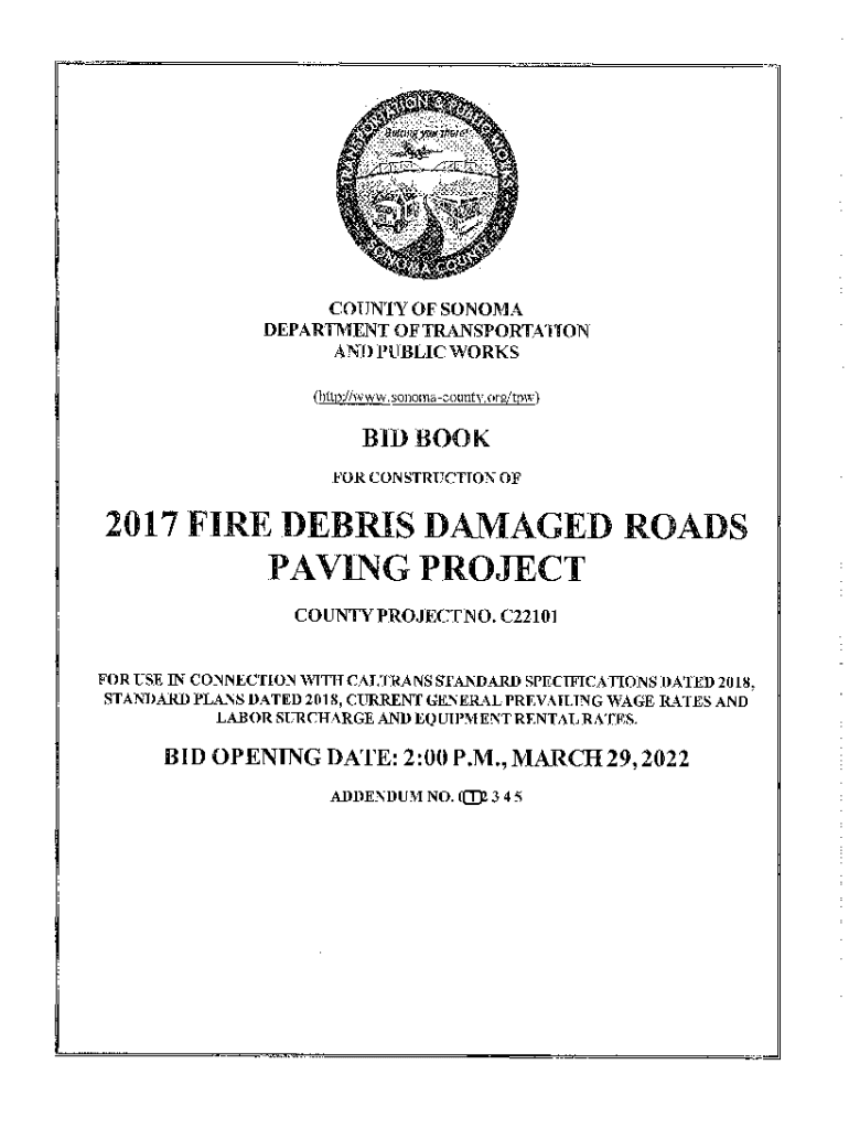 COUNTY OF SONOMA DEPARTMENT TRANSPORTATION AND PUBLIC WORKS (http://www.sonomacounty.org/tpw)BID BOOK FOR CONSTRUCTION OF2017 FIRE DEBRIS DAMAGED ROADS PAVING PROJECT COUNTY PROJECT NO. C22101FOR