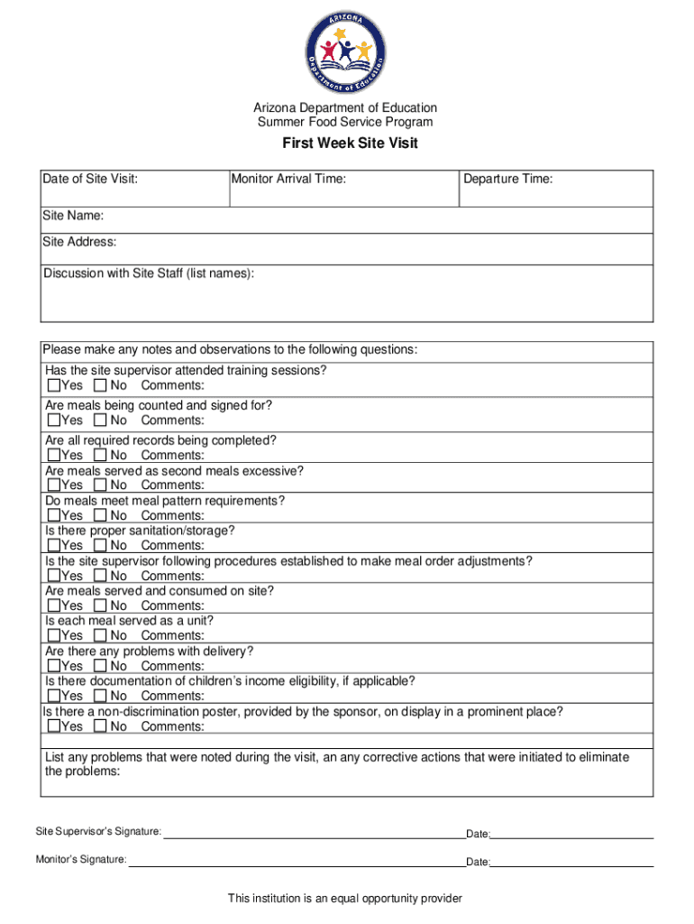 Get the free First Week Site Visit Form - Arizona Department of Education
