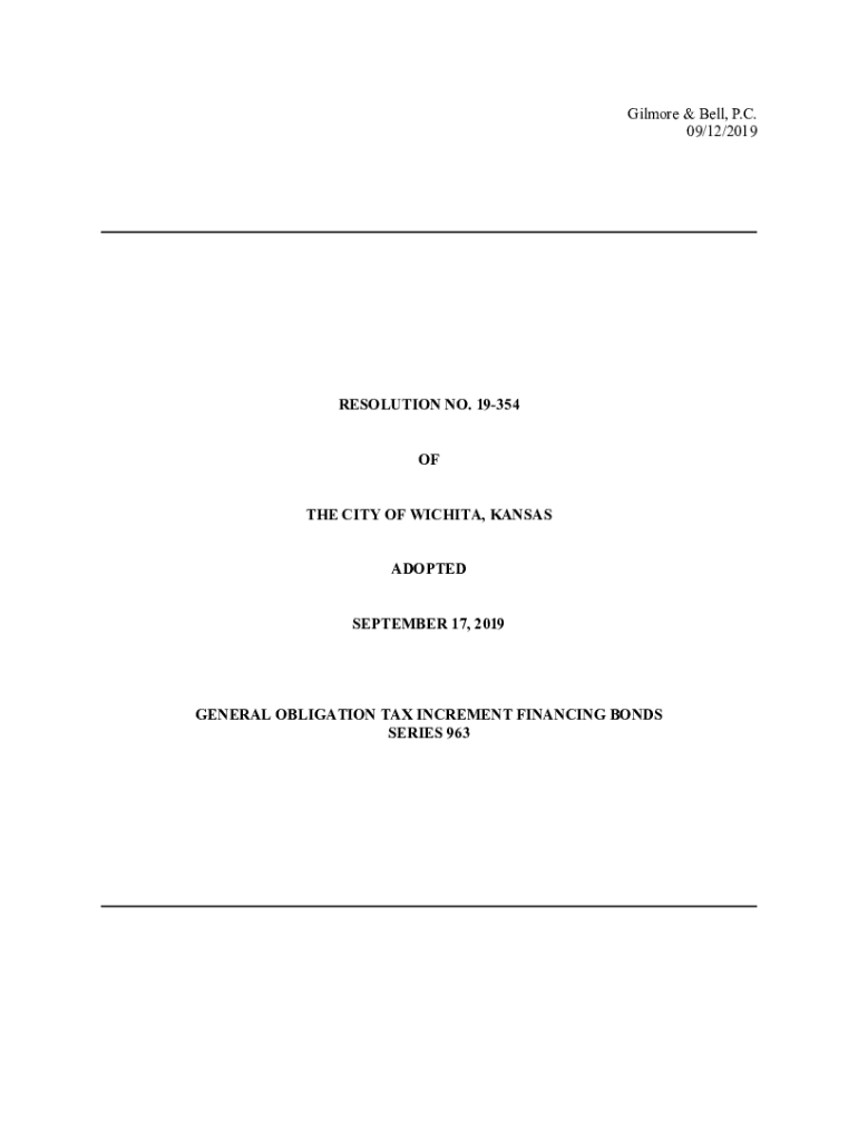 Gilmore & Bell, P.C. 09/12/2019RESOLUTION NO. 19354 OF THE CITY OF WICHITA, KANSAS ADOPTED SEPTEMBER 17, 2019GENERAL OBLIGATION TAX INCREMENT FINANCING BONDS SERIES 963TABLE OF CONTENTS ARTICLE I