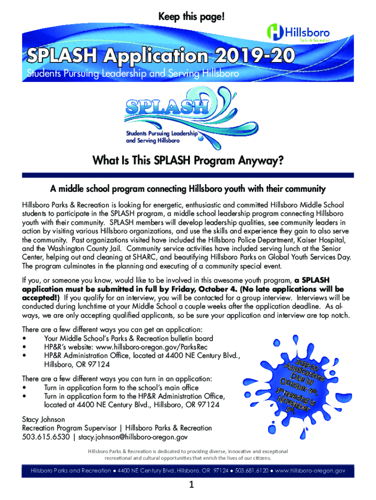 Keep this page!SPLASH Application 201920 Students Pursuing Leadership and Serving HillsboroStudents Pursuing Leadership and Serving HillsboroWhat Is This SPLASH Program Anyway? A middle school program