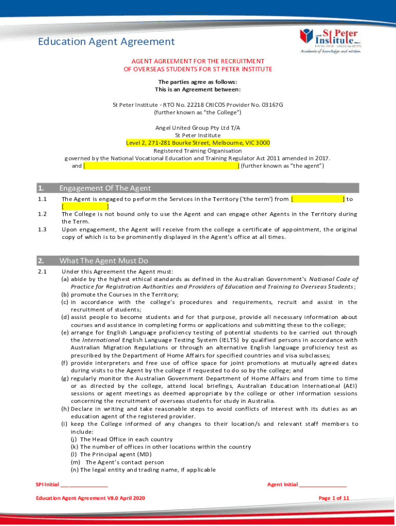 Education Agent Agreement FOR THE RECRUITMENT OF OVERSEAS STUDENTS FOR ST PETER INSTITUTE The parties agree as follows: This is an Agreement between: St Peter Institute RTO No. 22218 CRICKS Provider