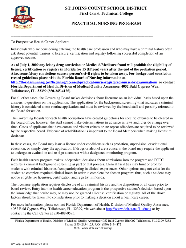 ST. JOHNS COUNTY SCHOOL DISTRICT First Coast Technical College PRACTICAL NURSING PROGRAM ___To Prospective Health Career Applicant: Individuals who are considering entering the health care profession