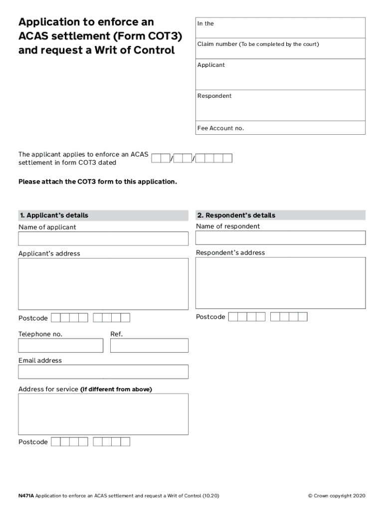 Application to enforce an ACAS settlement (Form COT3) and request a Writ of Control In the Claim number (To be completed by the court) ApplicantRespondentFee Account no. The applicant applies to enforce