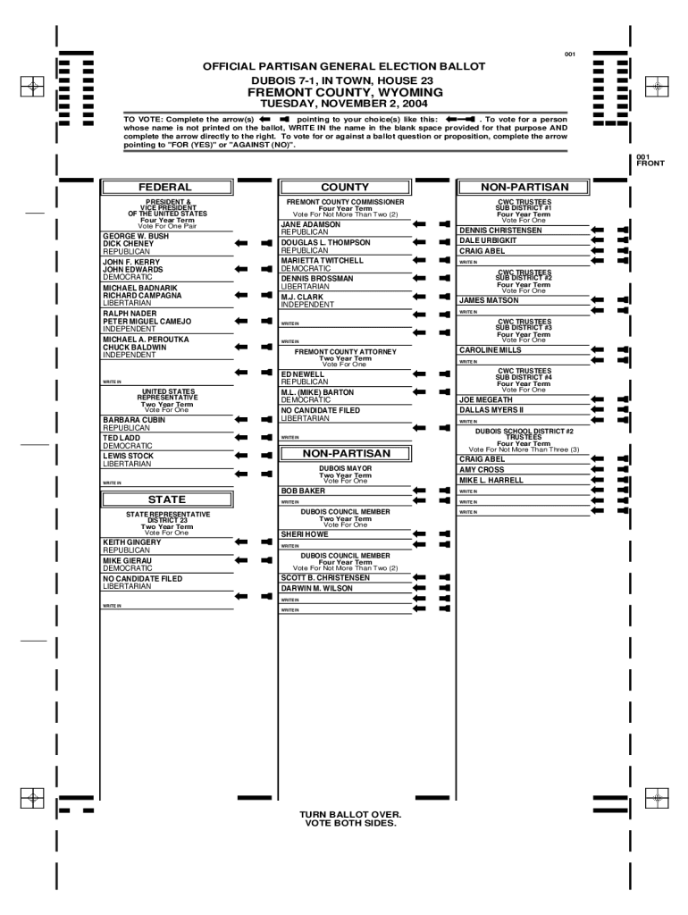 ! ! ! ! ! ! ! !001! ! ! ! ! ! ! !OFFICIAL PARTISAN GENERAL ELECTION BALLOT DUBOIS 71, IN TOWN, HOUSE 23FREMONT COUNTY, WYOMING TUESDAY, NOVEMBER 2, 2004, TO VOTE: Complete the arrow(s) pointing to