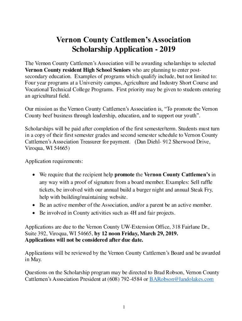 Vernon County Cattlemen Association Scholarship Application 2019 The Vernon County Cattlemen Association will be awarding scholarships to selected Vernon County resident High School Seniors who are