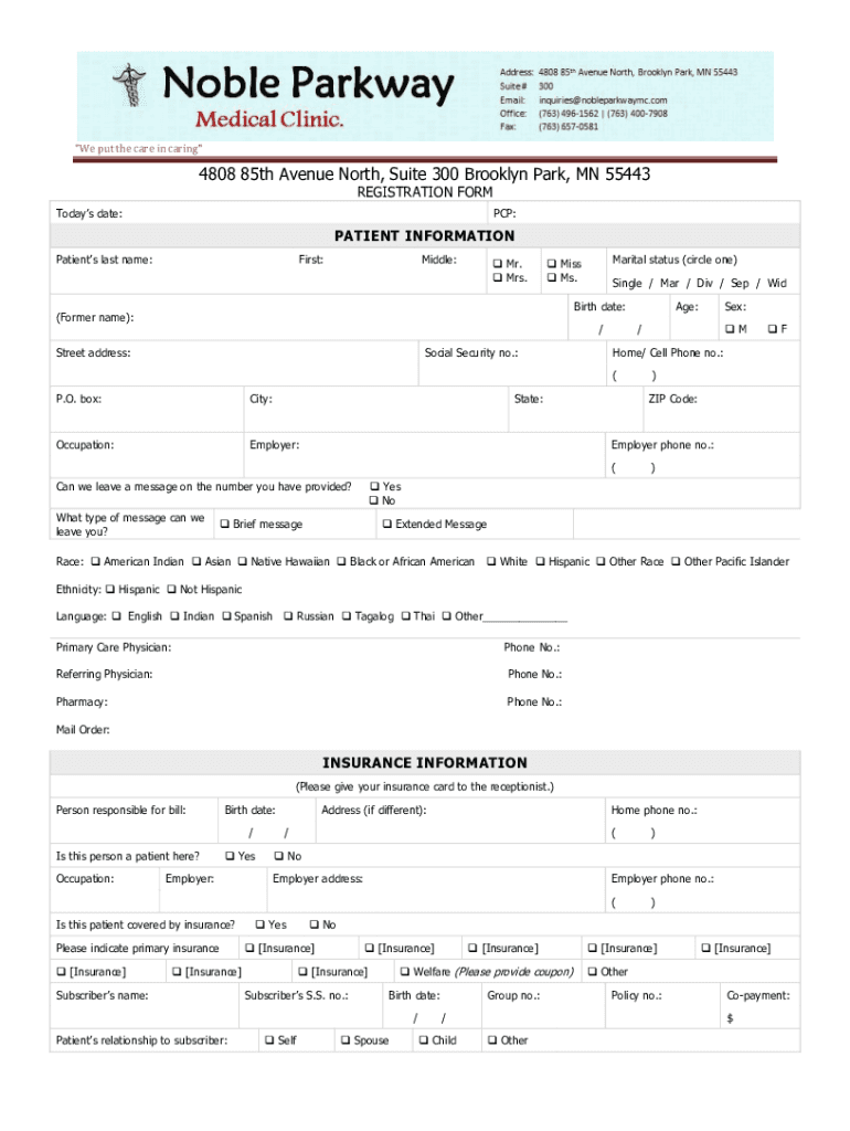 \” We put the care in caring\” 4808 85th Avenue North, Suite 300 Brooklyn Park, MN 55443 REGISTRATION FORMTodays date:PCP:PATIENT INFORMATION Patients last name:First:Middle: Mr. Mrs. Marital