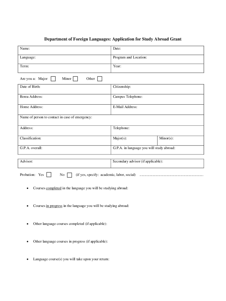 Department of Foreign Languages: Application for Study Abroad Grant Name:Date:Language:Program and Location:Term:Year:Are you a: MajorMinorOtherDate of Birth:Citizenship:Bar Address:Campus Telephone:Home