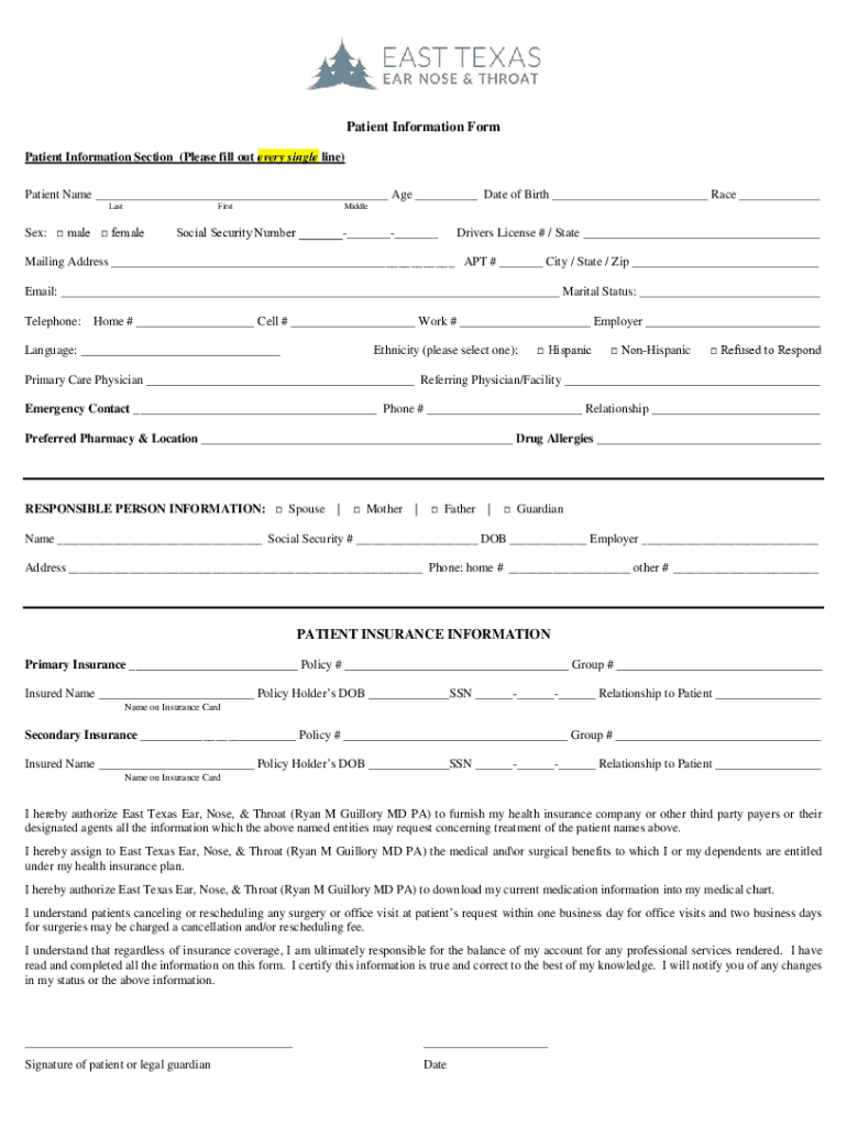 Get the free Patient Information Form - East Texas Ear, Nose, & Throat