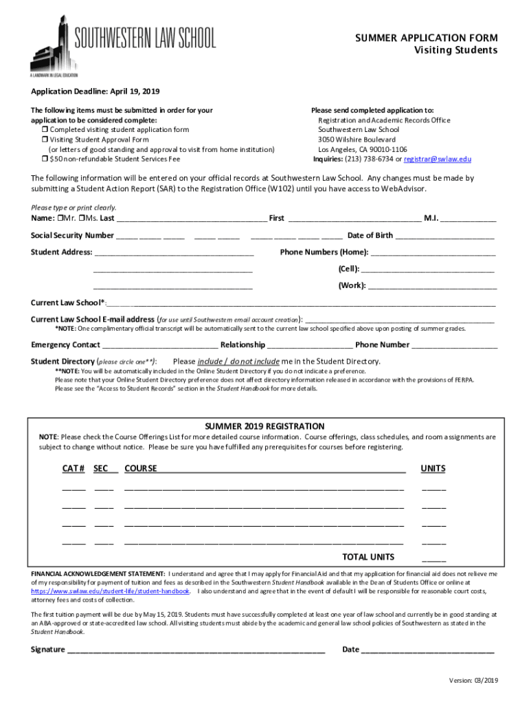 SUMMER APPLICATION FORM Visiting StudentsApplication Deadline: April 19, 2019, The following items must be submitted in order for your application to be considered complete: Completed visiting student
