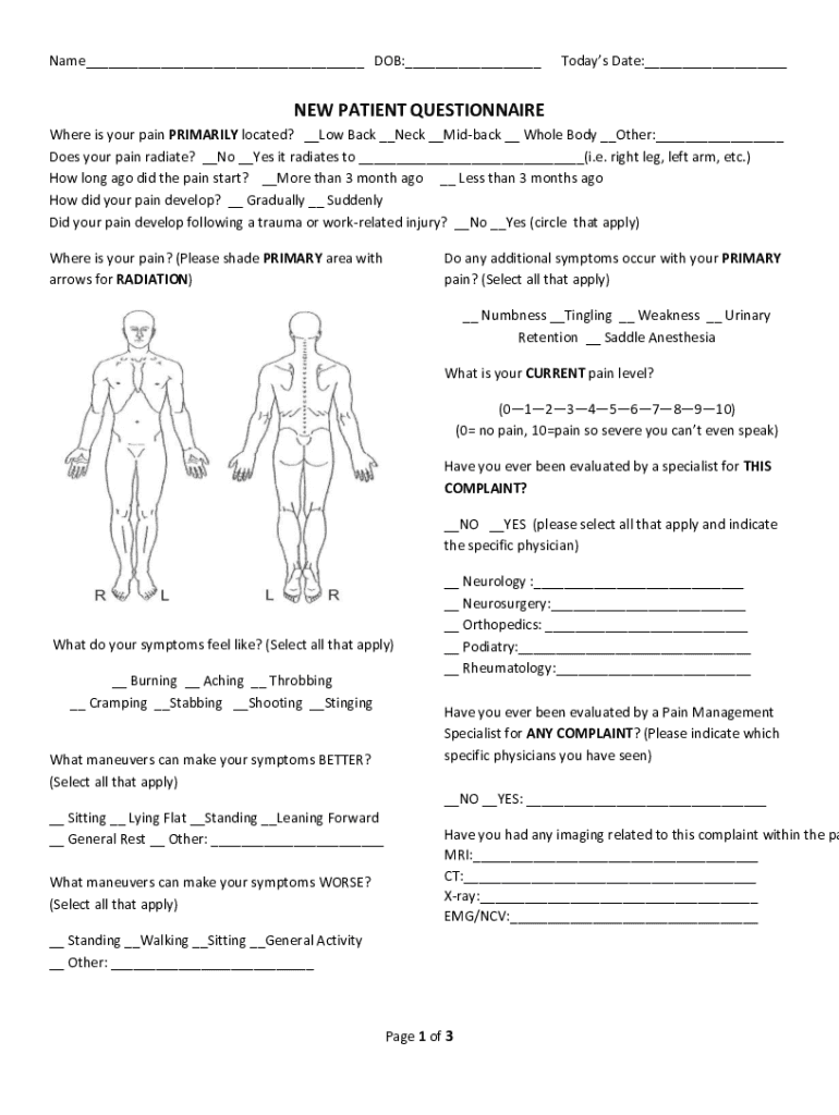Name___ DOB:___Today's Date:___NEW PATIENT QUESTIONNAIRE Where is your pain PRIMARILY located? __Low Back __Neck __Midback __ Whole Body __Other:___ Does your pain radiate? __No __Yes it radiates