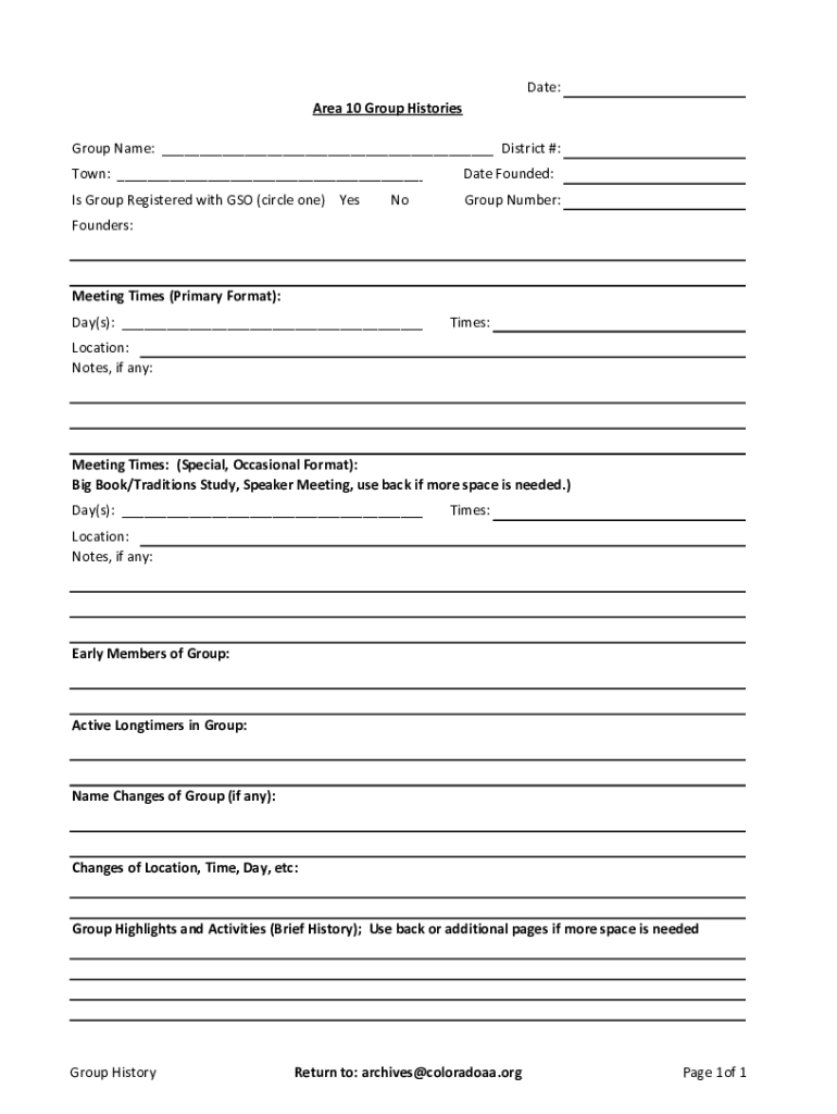 Date: Area 10 Group Histories Group Name: ___ District #: Town: ___Date Founded:Is Group Registered with GSO (circle one) Newsgroup Number:Cofounders:Meeting Times (Primary Format): Day(s): ___Times:Location: