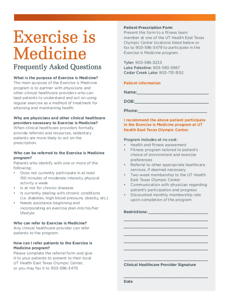 Exercise is MedicineFrequently Asked Questions What is the purpose of Exercise is Medicine? The main purpose of the Exercise is Medicine program is to partner with physicians and other clinical healthcare