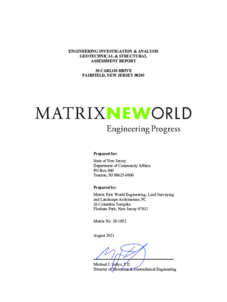 ENGINEERING INVESTIGATION & ANALYSIS GEOTECHNICAL & STRUCTURAL ASSESSMENT REPORT 30 CARLOS DRIVE FAIRFIELD, NEW JERSEY 08203Prepared for: State of New Jersey Department of Community Affairs PO Box