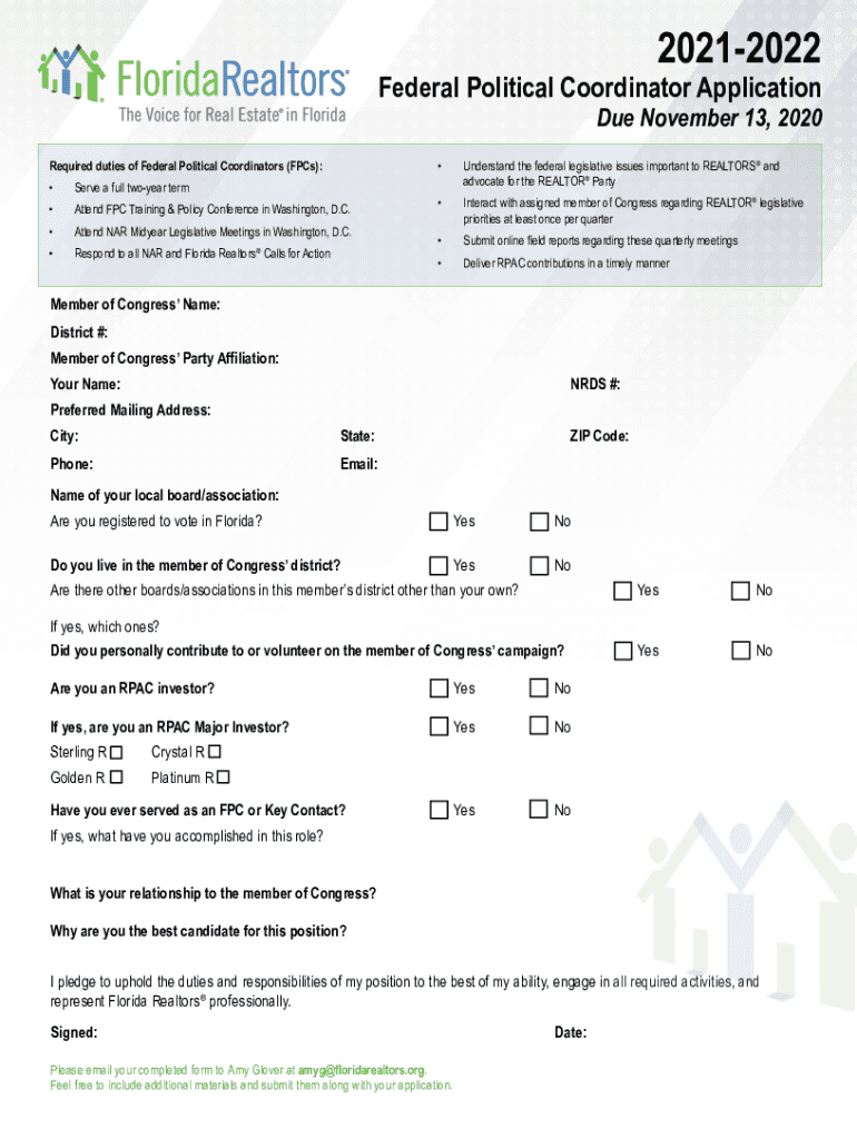 20212022Federal Political Coordinator Application Due November Required duties of Federal Political Coordinators (PCs): Serve a full two year permitted FPC Training & Policy Conference in Washington,