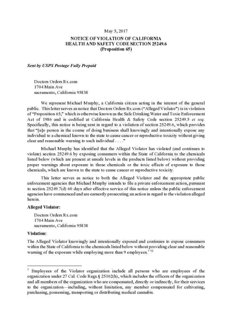 May 5, 2017, NOTICE OF VIOLATION OF CALIFORNIA HEALTH AND SAFETY CODE SECTION 25249.6 (Proposition 65) Sent by USPS Postage Fully Prepaid Doctors Orders Rx.com 1704 Main Ave Sacramento, California