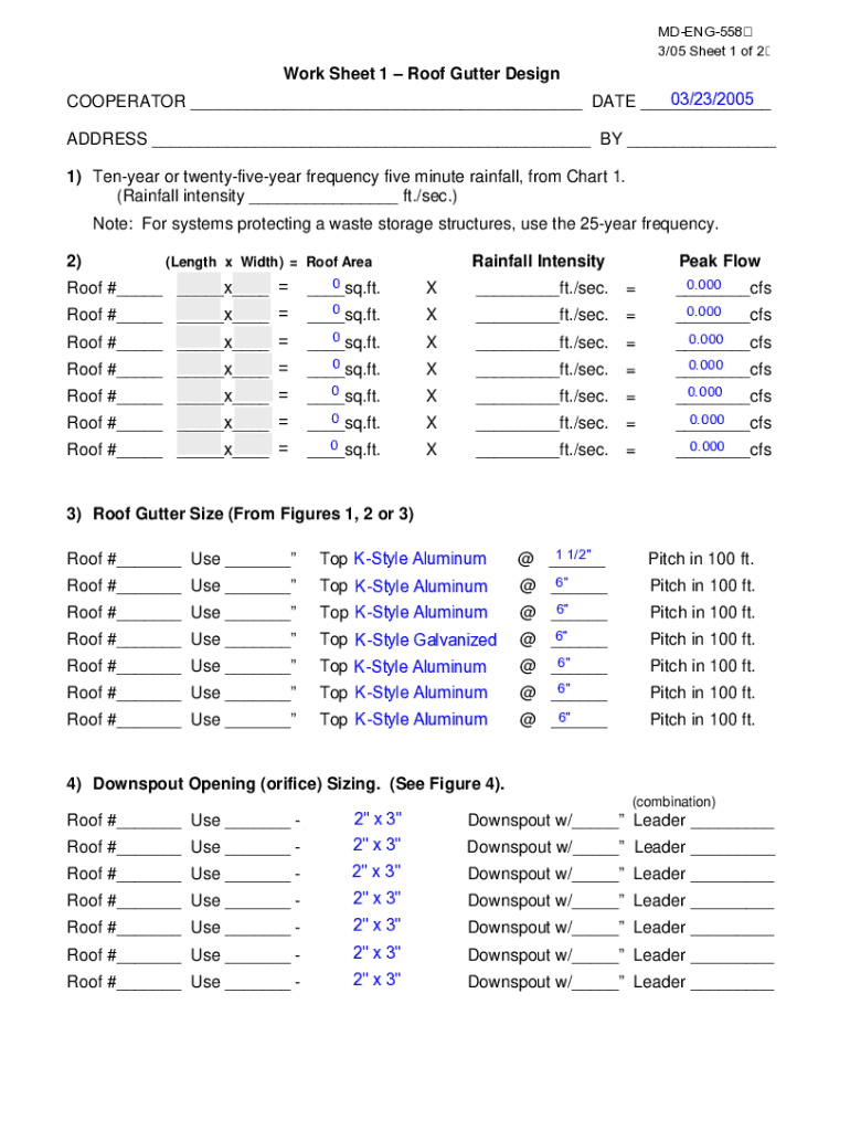 MDENG558 3/05 Sheet 1 of 2Work Sheet 1 Roof Gutter Design03/23/2005 COOPERATOR ___ DATE ___ ADDRESS ___ BY ___ 1) Ten year or twentyfiveyear frequency five minute rainfall, from Chart 1. (Rainfall