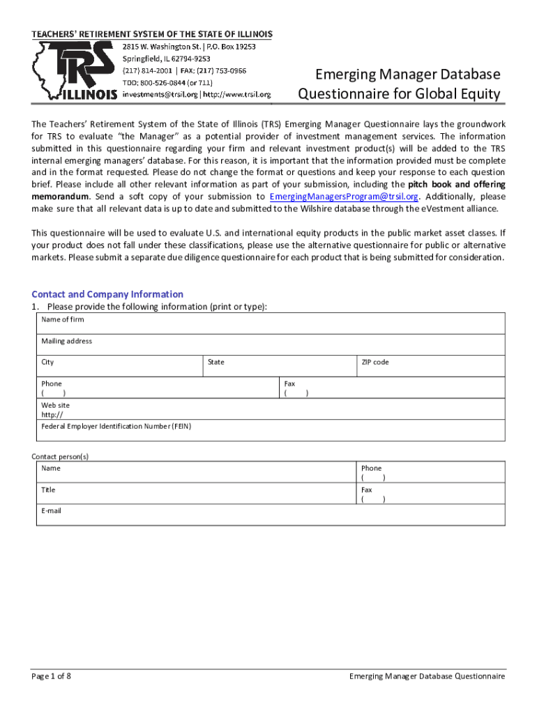Emerging Manager Database Questionnaire for Global Equity The Teachers Retirement System of the State of Illinois (TRS) Emerging Manager Questionnaire lays the groundwork for TRS to evaluate the Manager