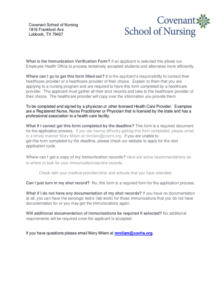 Covenant School of Nursing 1919 Frankfort Ave Lubbock, TX 79407What is the Immunization Verification Form? If an applicant is selected this allows our Employee Health Office to process tentatively