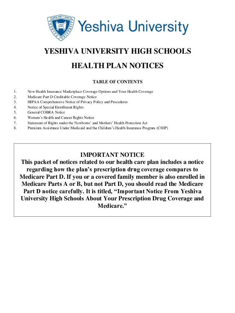 YESHIVA UNIVERSITY HIGH SCHOOLS HEALTH PLAN NOTICES TABLE OF CONTENTS 1. 2. 3. 4. 5. 6. 7. 8. New Health Insurance Marketplace Coverage Options and Your Health Coverage Medicare Part D Creditable