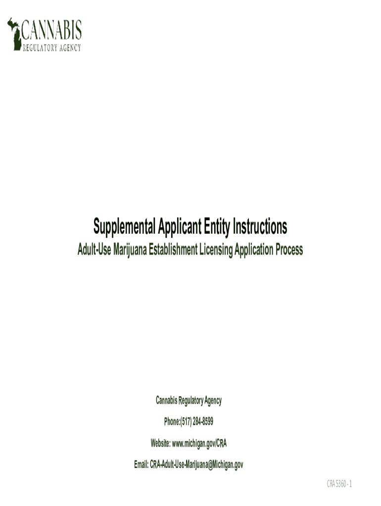 Supplemental Applicant Entity Instructions Adults Marijuana Establishment Licensing Application ProcessCannabis Regulatory Agency Phone:(517) 2848599 Website: www.michigan.gov/CRA Email: CRAAdultUseMarijuana×Michigan.gov