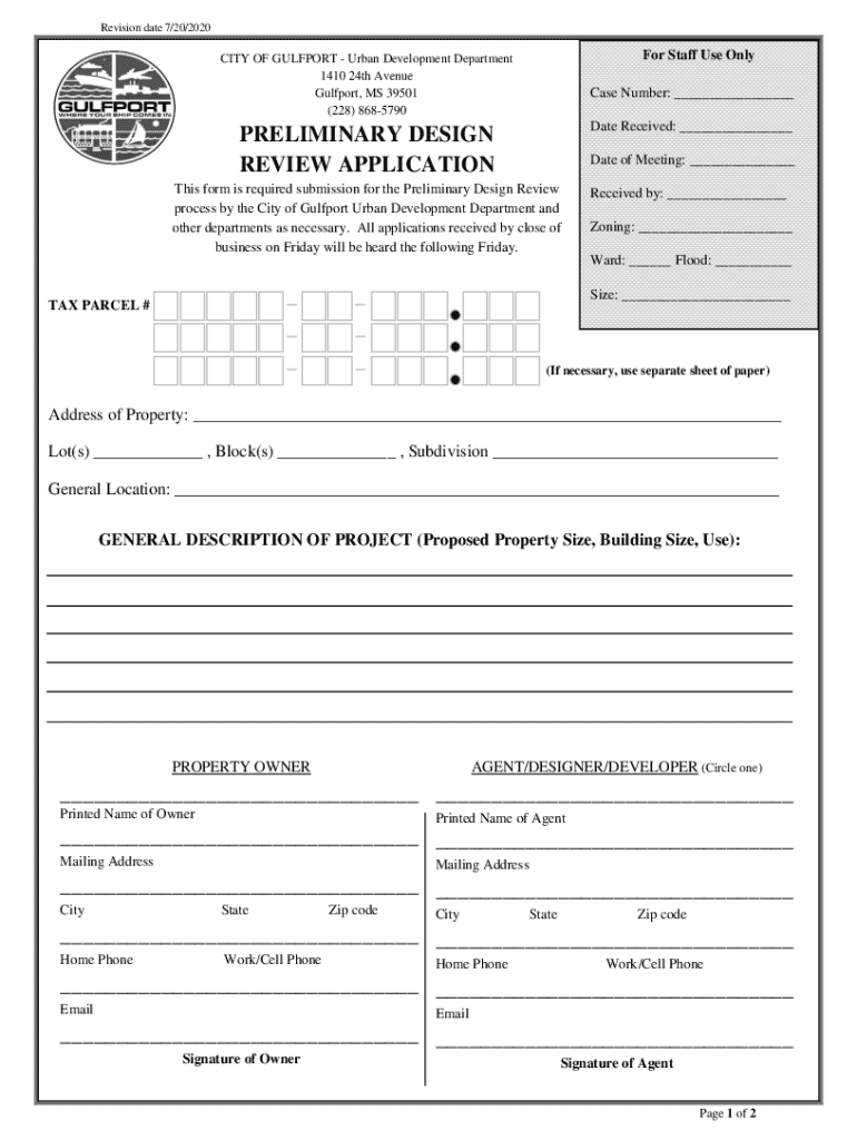 Revision date 7/20/2020For Staff Use Velocity OF GULFPORT Urban Development Department 1410 24th Avenue Gulfport, MS 39501 (228) 8685790Case Number: ___PRELIMINARY DESIGN REVIEW APPLICATIONDate Received: