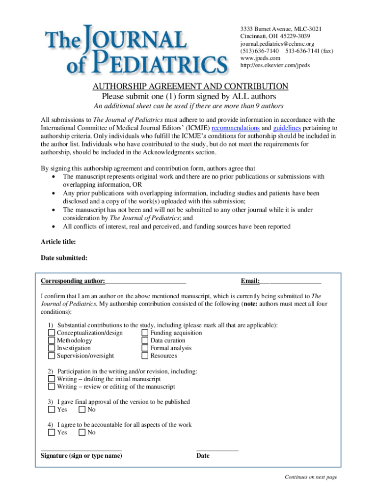 3333 Burned Avenue, MLC3021 Cincinnati, OH 452293039 journal. Pediatrics@CCC.org (513) 6367140 5136367141 (fax) www.jpeds.com http://ees.elsevier.com/jpedsAUTHORSHIP AGREEMENT AND CONTRIBUTION Please