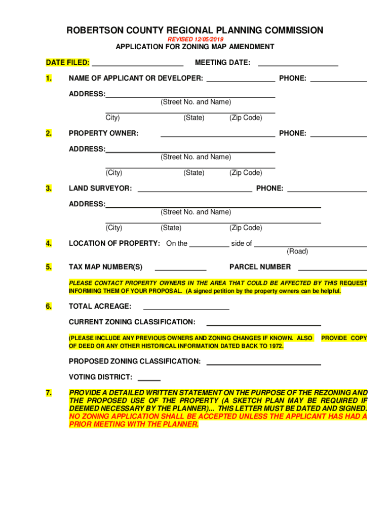 ROBERTSON COUNTY REGIONAL PLANNING COMMISSION REVISED 12/05/2019APPLICATION FOR ZONING MAP AMENDMENT DATE FILED: 1.MEETING DATE:NAME OF APPLICANT OR DEVELOPER:PHONE:ADDRESS: (Street No. and Name)