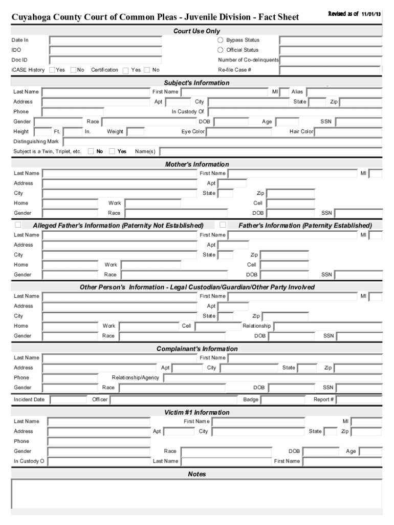 Revised as of 11/01/13Cuyahoga County Court of Common Pleas Juvenile Division Fact Sheet Court Use Only Date Bypass StatusIDOOfficial Status IDN umber of CodelinquentsiCASE HistoryYesNoCertificationYesNoRefile