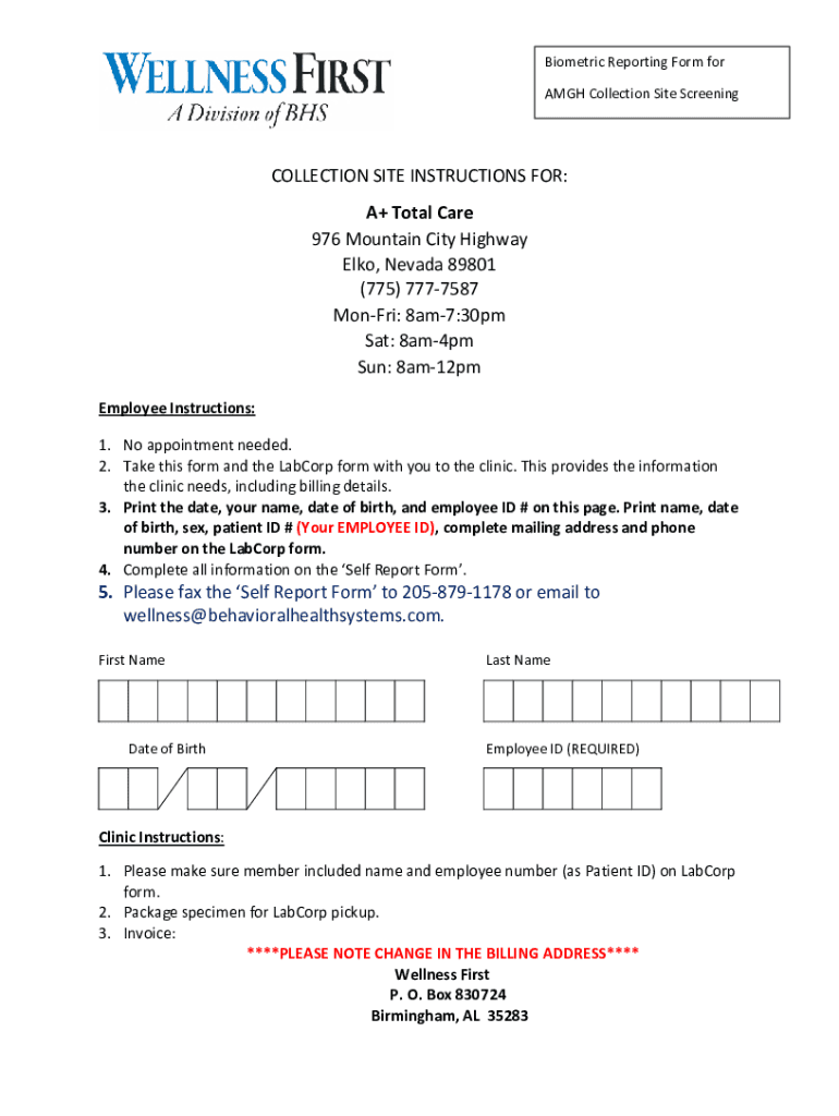 Biometric Reporting Form for AGH Collection Site ScreeningCOLLECTION SITE INSTRUCTIONS FOR: A+ Total Care 976 Mountain City Highway Elk, Nevada 89801 (775) 7777587 Mon Fri: 8am7:30pm Sat: 8am4pm Sun: